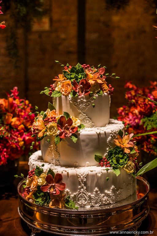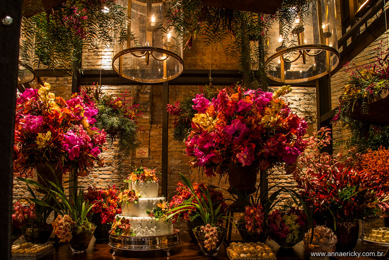 Na mesa de doces, 03 lustres com estilo industrial e muitos arranjos altos de flores, destaque para as orquídeas. O Bolo foi da Piece of cake, de cenoura com chocolate ( o bolo predileto da noiva ).