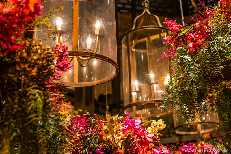 Logo na entrada um corredor de luzes e diversas espécies de plantas, antes da escada principal a lembrancinha do casamento - uma porcelana em uma linda caixa com o nome dos noivos ). A festa aconteceu para 500 convidados, todos sentando em mesas.